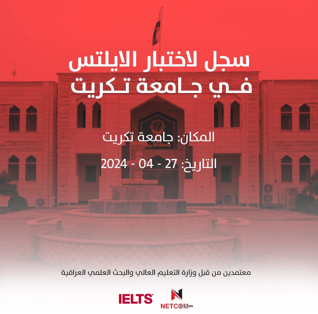 تعلن جامعة تكريت عن استضافتها لاختبار IELTS الرسمي الذي سيقام بتاريخ 6-4-2024 وعلى قاعة مركز التعليم المستمر فعلى المتقدمين إلى الدراسات العليا أو المهتمين ، الإسراع بالتسجيل علما أن الاختبار معترف به دوليا لأغراض الدراسة والعمل والسفر. سارع بالتسجيل على اختبار الآيلتس المقاعد محدودة موعد الامتحان 27-4-2024 للتسجيل الدخول الى رابط الاستمارة الالكترونية وملئ المعلومات: