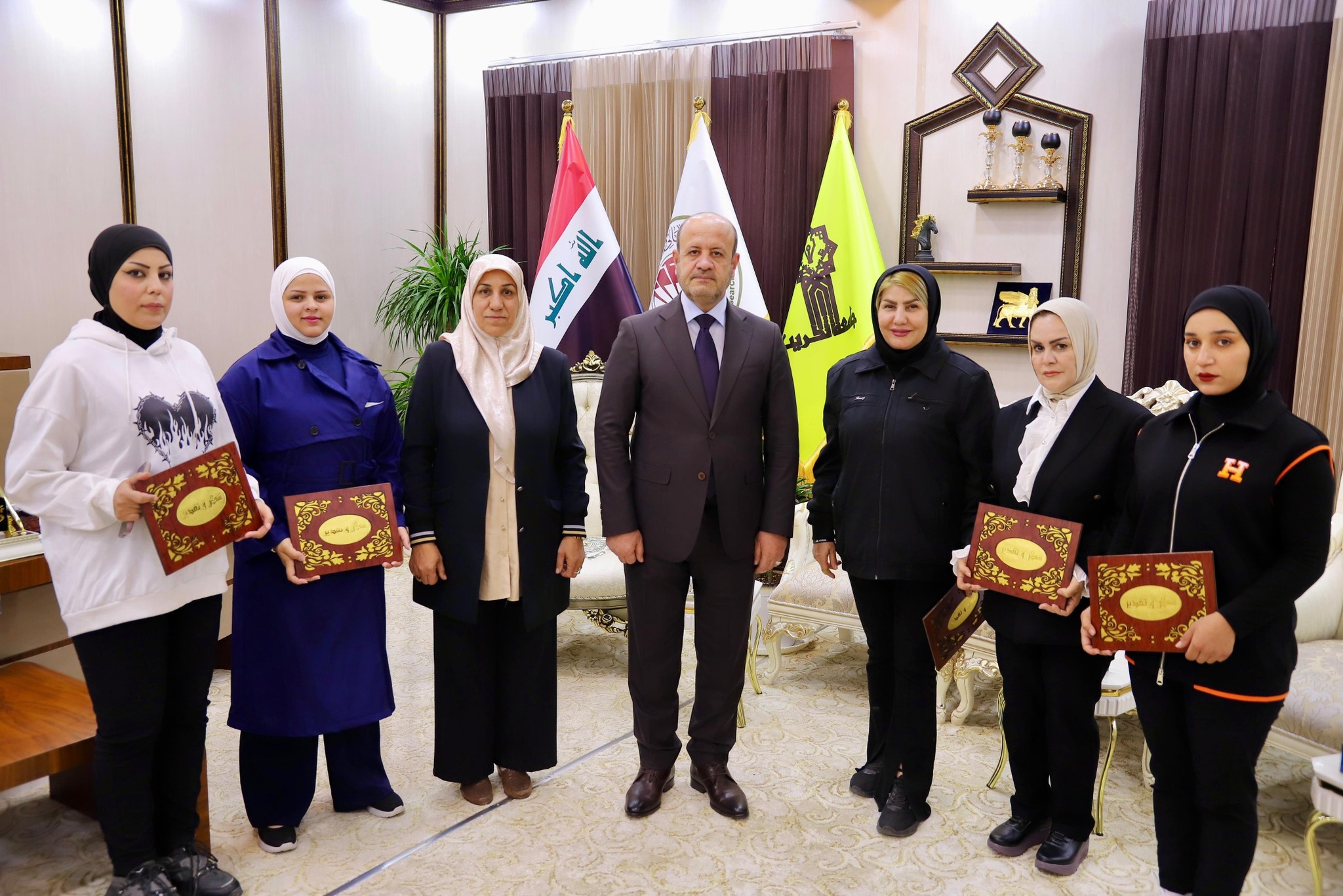 وبهذه المناسبة، حصل فريق الطالبات (الدليلات) على كتب شكر وتقدير من وزارة التعليم العالي والبحث العلمي تقديراً لتميزهن. وقام رئيس الجامعة بتسليم فريق الدليلات كتب الشكر بنفسه، مثمناً جهودهم وحرصهم على تحقيق مراكز متقدمة تعكس صورة مشرّفة عن الجامعة.