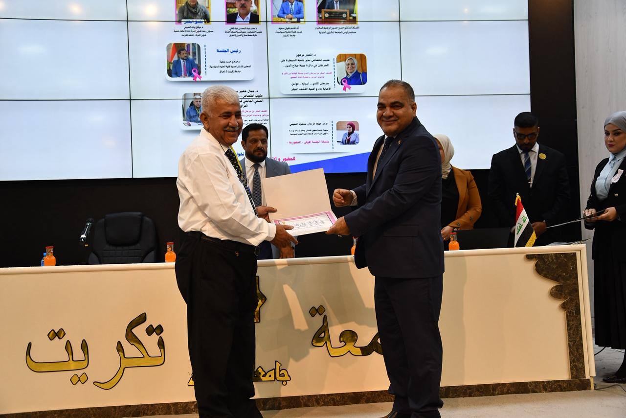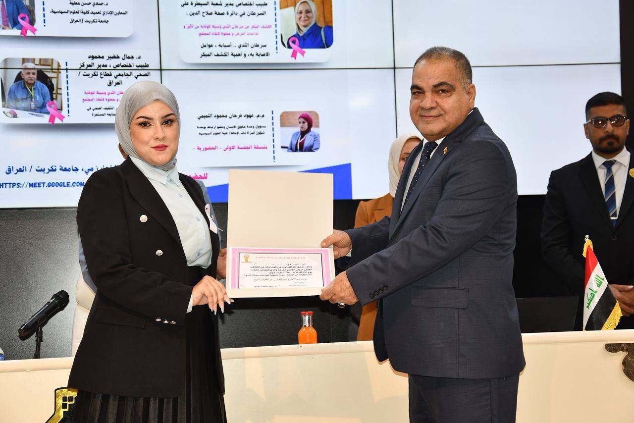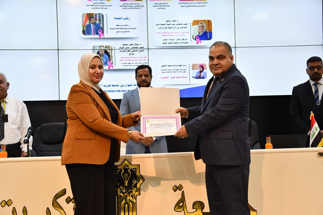 وأكد المساعد العلمي والذي حضر نيابةً عن السيد رئيس الجامعة، أن جامعة تكريت تضع خدمة الإنسان وتعزيز الوعي الصحي ضمن أولوياتها، مشيداً بالجهود الوطنية والدولية التي تتضافر في سبيل مكافحة سرطان الثدي ودعم المصابات والمتعافيات نفسيًا واجتماعياً.