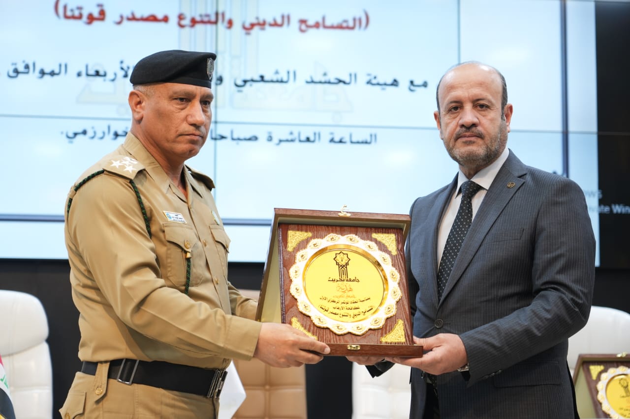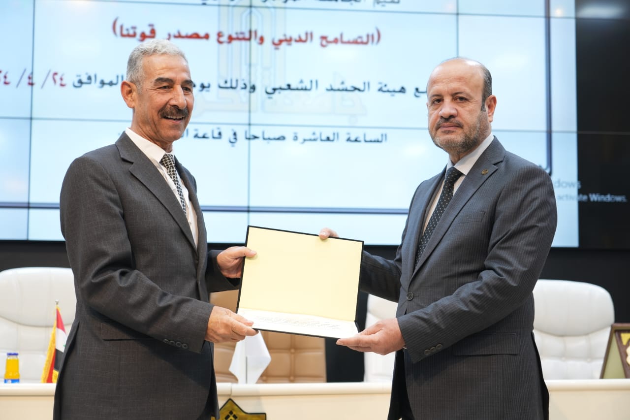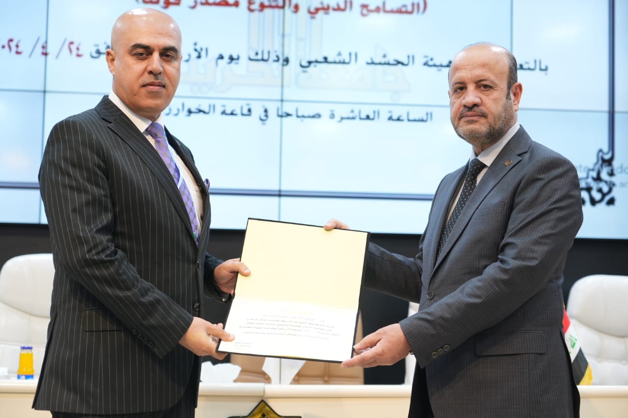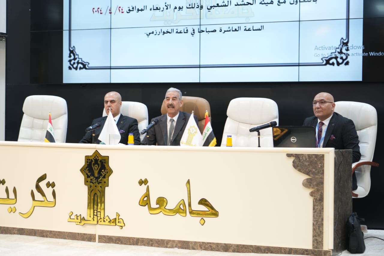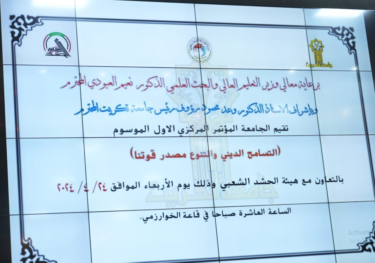 برعاية معالي وزير التعليم العالي والبحث العلمي الدكتور نعيم العبودي وبإشراف الاستاذ الدكتور وعد محمود رؤوف رئيس جامعة تكريت وبالتعاون مع هيئة الحشد الشعبي وبحضور الشيخ محمد حسن عطية نائب رئيس مجلس محافظة صلاح الدين و مساعدي رئيس الجامعة للشؤون العلمية و الاداري وعددٍ من اعضاء مجلس الجامعة وشخصيات دينية وأمنية وثقافية وإجتماعية واكاديمية اقامت رئاسة جامعة تكريت اليوم الاربعاء الموافق 24/4/2024 وعلى قاعة الخوارزمي مؤتمرها العلمي المركزي الاول الموسوم (التسامح الديني والتنوع مصدر قوتنا) .