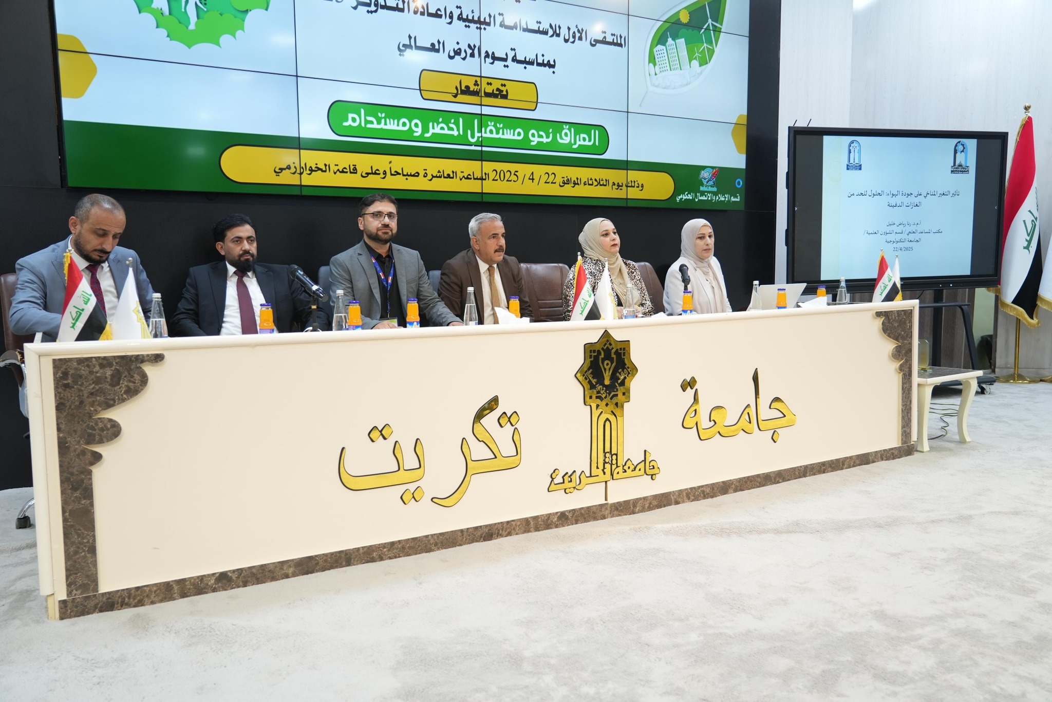 برعاية وحضور رئيس جامعة تكريت الاستاذ الدكتور وعد محمود رؤوف وبإشراف الاستاذ الدكتور عبدالخالق علوان محيميد عميد كلية العلوم وبحضور الاستاذ الدكتور علي عبدالزهرة زبون اللامي مستشار دولة رئيس الوزراء لشؤون البيئة والمناخ والدكتور احمد ياسين الجنابي ممثل لجنة البيئة البرلمانية وبمناسبة يوم الارض العالمي اقامت كلية العلوم بجامعة تكريت الملتقى الاول للإستدامة البيئية واعادة التدوير 2025 وتحت شعار ( العراق نحو مستقبل اخضر ومستدام)