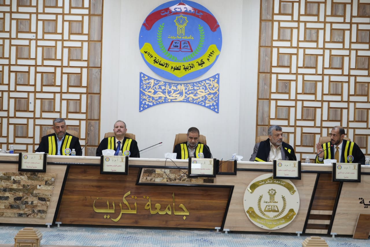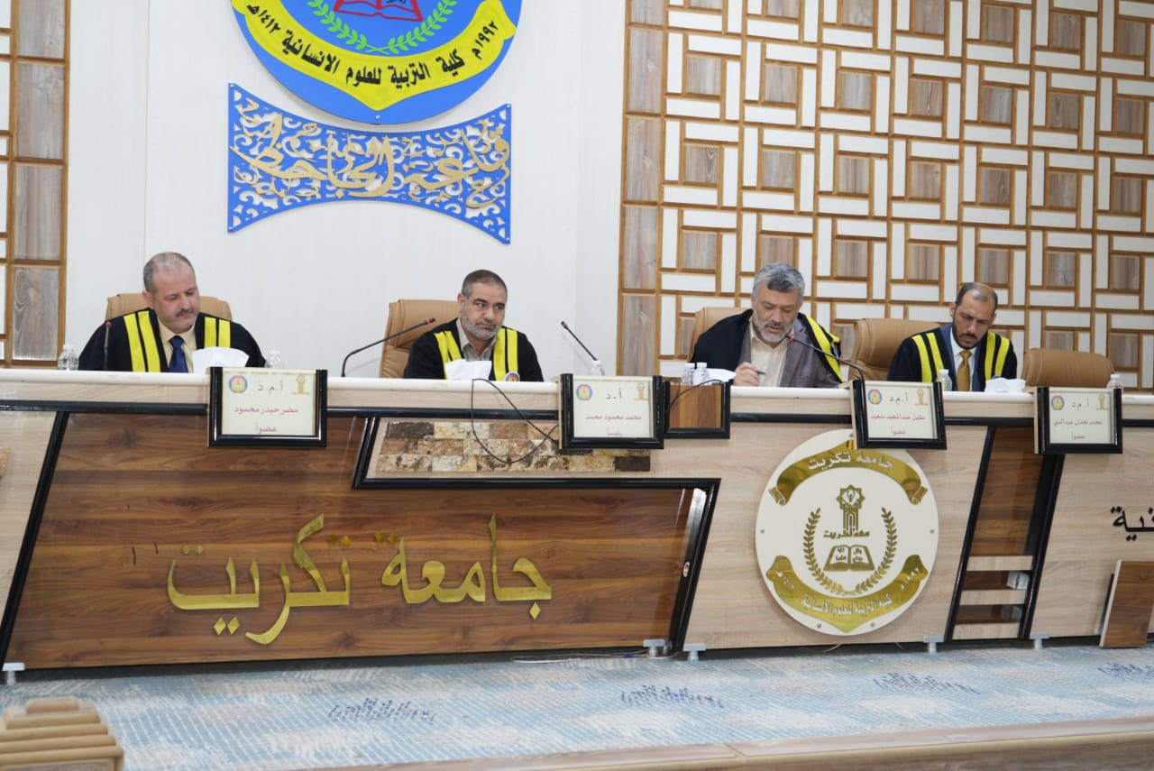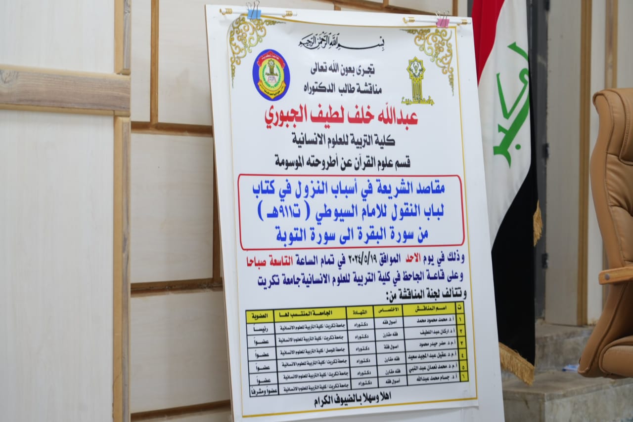 ضمن جولاته المستمرة في كليات واقسام ومفاصل الجامعة حضر الاستاذ الدكتور وعد محمود رؤوف رئيس جامعة تكريت مناقشة اطروحة الدكتوراه للطالب عبد الله خلف لطيف الجبوري من كلية التربية للعلوم الانسانية قسم علوم القرآن عن أطروحته الموسومة (مقاصد الشريعة في أسباب النزول في كتاب لباب النقول للامام السيوطي ( ت٩١١ هـ ) من سورة البقرة الى سورة التوبة) احتضنتها قاعة الجاحظ بالكلية وقد اثنى رئيس الجامعة على دقة الملاحظات العلمية التي طرحتها لجنة المناقشة وصوابها وبارك الجهود المبذولة في هذه الرسالة من قبل الطالب ولجنة المناقشة والاستاذ المشرف