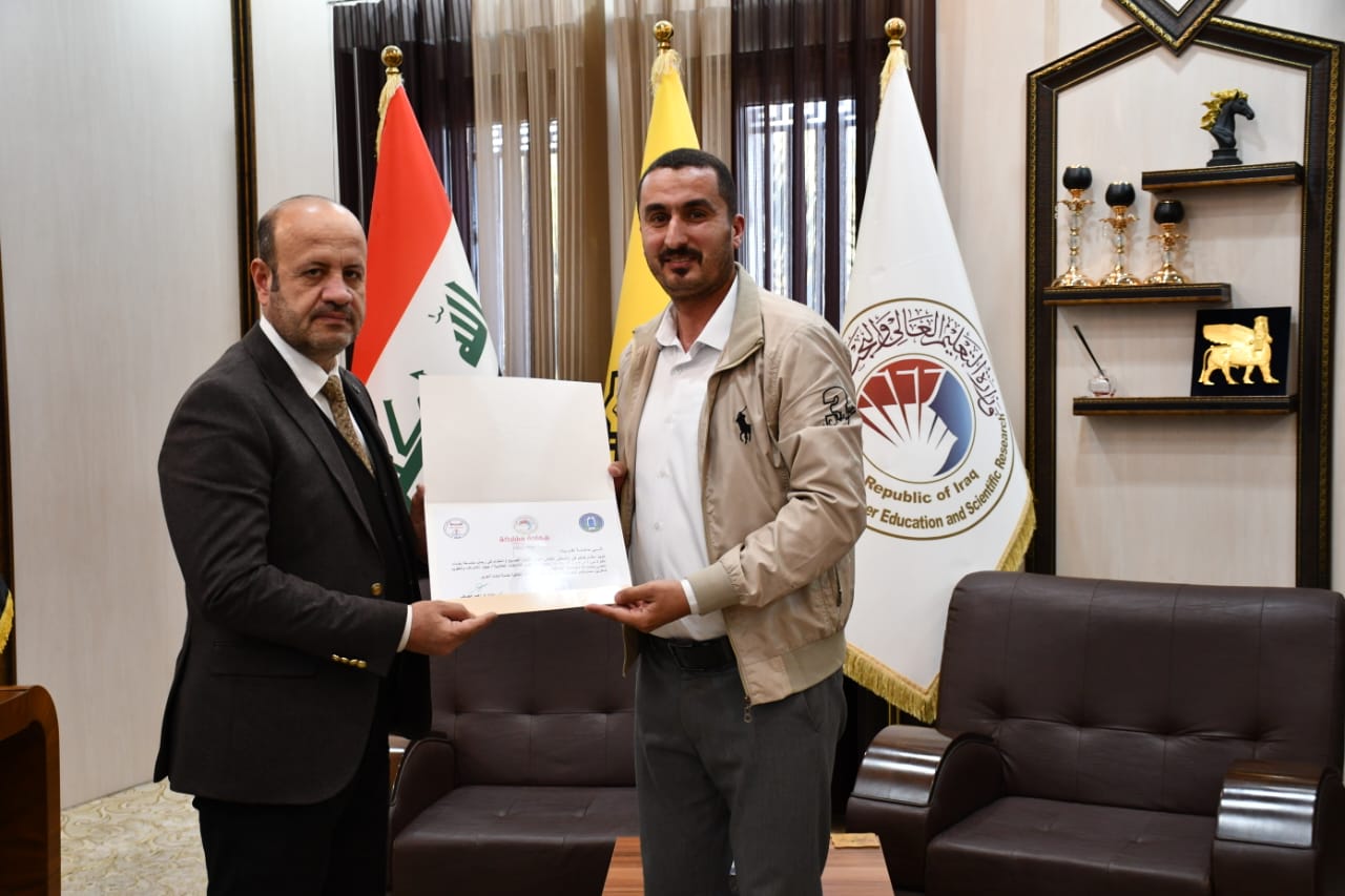 استقبل الاستاذ الدكتور وعد محمود رؤوف رئيس جامعة تكريت في مكتبه السيد عبداللطيف شريف شهاب مدير قسم النشاطات الطلابية رئيس وفد الجامعة الحاصل على المركز الثالث عشر في ملتقى جامعة بغداد الثقافي الدولي للشعر الفصيح الذي اقامه قسم النشاطات الطلابية في جهاز الاشراف والتقويم العلمي بوزارة التعليم العالي والبحث العلمي بمشاركة اكثر من ٥٧ جامعة حكومية واهلية تنافس ٩٧ طالب وطالبة على المراتب الثلاثة الأولى فيه للفترة من ١١-١٥ / ٢ / ٢٠٢٤ على رحاب جامعة بغداد
